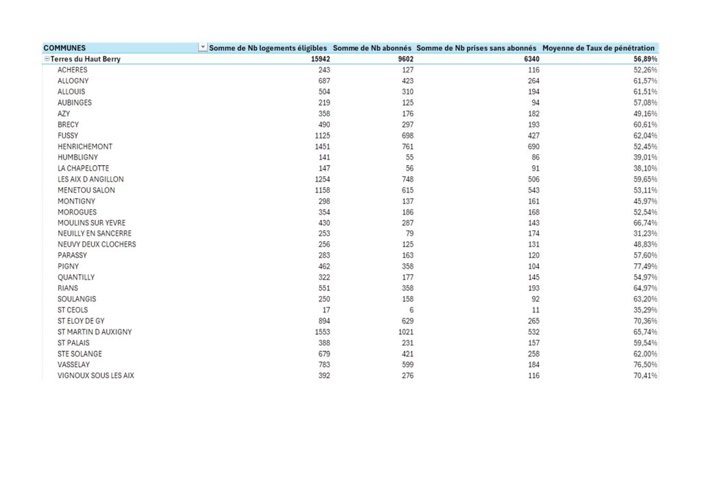 Nous suivons attentivement le taux de pénétration à l’échelle de la communauté de communes, commune par commune, afin d’identifier les zones à prioriser et de garantir une couverture homogène du Berry.
